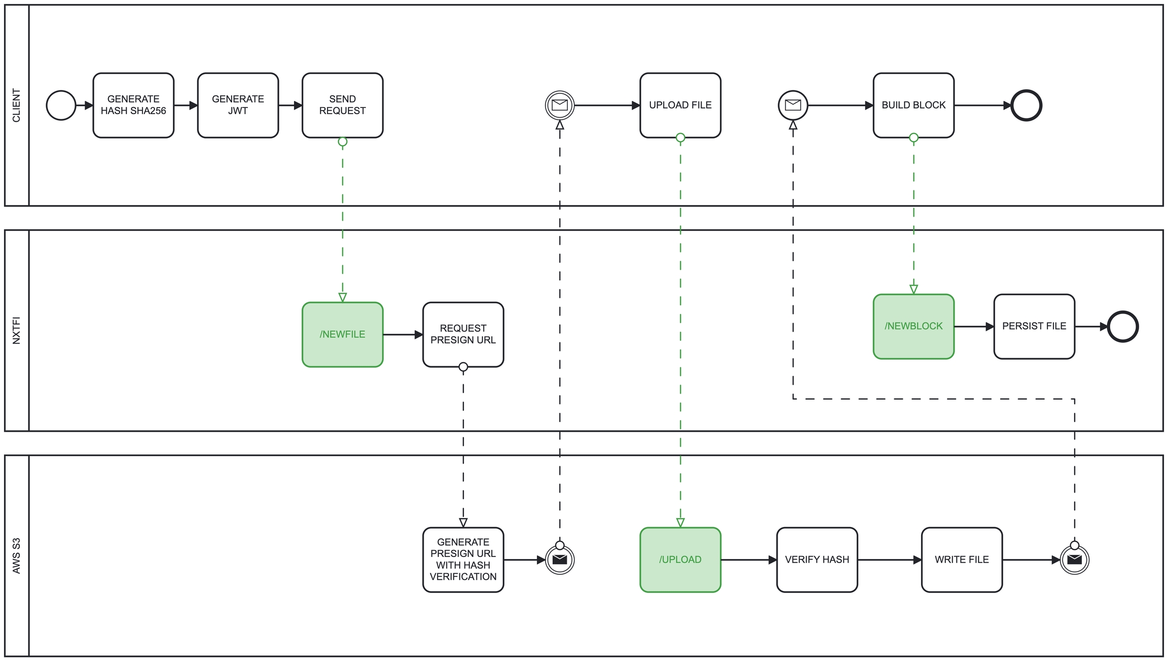 The first step after checking content-type and size is to request a pre signed url to upload the file. A JWT signature is going to be required in order to confirm that who signed the request and upload the file to the temporary staging area is in possession of authorized keys with write permissions in NxtFi API